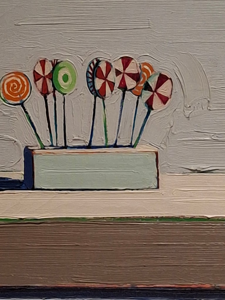 I loved Maggie O’Farrell’s book Hamnet. I did not like Lolita Chakrabarti’s stage version which a gang of us went to see at the Garrrick with great expectations and emerged with great disapppointment. I had misgivings therefore about the much talked-about film version, somehat allayed when I noted that Chloé Zhao co-wrote it with the book’s author. So I booked a matinee showing at Picturehouse Central and decided to go into town early and take in the last few days of Wayne Thibault at the Courtauld Gallery. I don’t think I’d heard of him but an email from the gallery intrigued me so off I went and am very glad I did, The exhibition was entirely of works from the 1960s when he was grouped with the Pop Art movement. He painted still lives of everyday Americana – slot machines, deli counters, cakes and the like. They were very affecting in making you look intensely at the ordinary and think about things in a new way. He also made prints of several of the subjects one of which on display he had hand coloured twenty years after making the original etching.