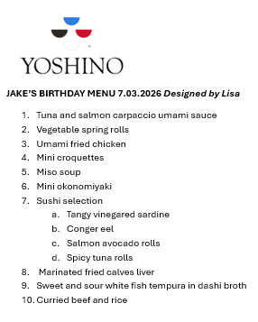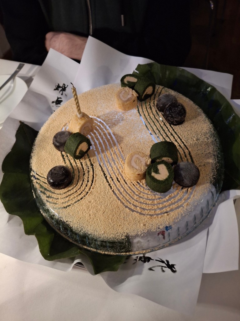 However when Jake said he’d like his birthday dinner at Yoshino there was rejoicing in lots of the family with a little trepidation on the part of a slightly picky Daisy. So I asked Lisa to book us in and design a menu for us with alternatives for Daisy. She pulled out all the stops and gave us an absolute feast of taste and texture sensations including making an alcohol free campari for non-drinker Jake. And as she had run out of my ‘usual’ sake – I wonder why – she offered me two options to taste before we settled on an excellent dry alternative. Daisy surprised herself and us by being really adventurous and enjoying things she wouldn’t have looked at – sake included. On a previous visit we’d tried a curry dish and had not been impressed. Lisa brought us a bowl of curry and rice saying it was spice combination number 47. Well this variety certainly hit the spot.This wonderful evening concluded with Lisa and her colleague Naomi bringing Jake a birthday cake of ice cream filled chocolates and soy and matcha mochi swiss roll slices all arranged on a raked zen garden. What a night! What service!