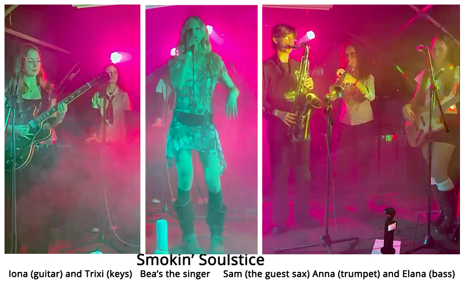 The next Sunday I had a music experience of a very different kind with a trip to an arch under Herne Hill Station to wear my SOULSTICE GRANDAD T-shirt with pride and see the group in which my granddaughter (Daisy but Trixi in the band) plays keyboard and flute and sings. Every time I see them they get better – different set list incorporating original material and covers, tighter arrangements and harmonies and tonight they had a guest saxophonist Sam to add to the exhilarating session amid the smoke machines and lighting of the Off The Cuff venue. (Image below contains stills from a video courtesy of Chris Addison as holding a pint in one hand and my coat in the other I couldn’t get my phone out.)