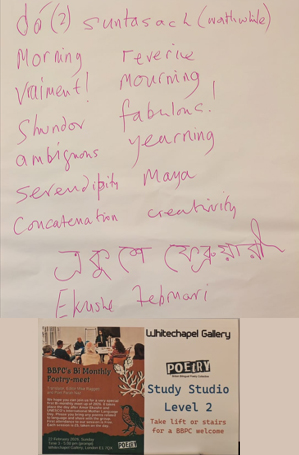 Saturday 21 was UNESCO International Mother Language Day so it was appropriate that our British Bilingual Poetry Collective (BBPC) group had our regular meeting on Sunday 22 and could focus on the topic with a group of regulars and two people joining us for the first time. I outlined the origin of the Day which started in Bangladesh when five students were executed for speaking Bengali rather tha Urdu and was observed there ever since. Then the government suggested to UNESCO that it should be global which it has been since 1999. I had asked my friend Shumi to bring her delightful poem Banglish about her experience of growing up bilingually in London, I had sourced a number of others I could read and a lively discussion ensued with contributions with many different experiences. We had a technical task to conclude in which all of us suggested two words which I then wrote up on the flip chart. The session’s ‘homework’ was to write a poem incorporating all the words. Three poems resulted which were not bad at all. If you want to give it a try the words are below. As some of the group were observing the Ramadan fast, we repaired to a local restaurant to enjoy iftar the moment the sun set. The chef did a count down for us and then promptly brought much-needed, by some, food.