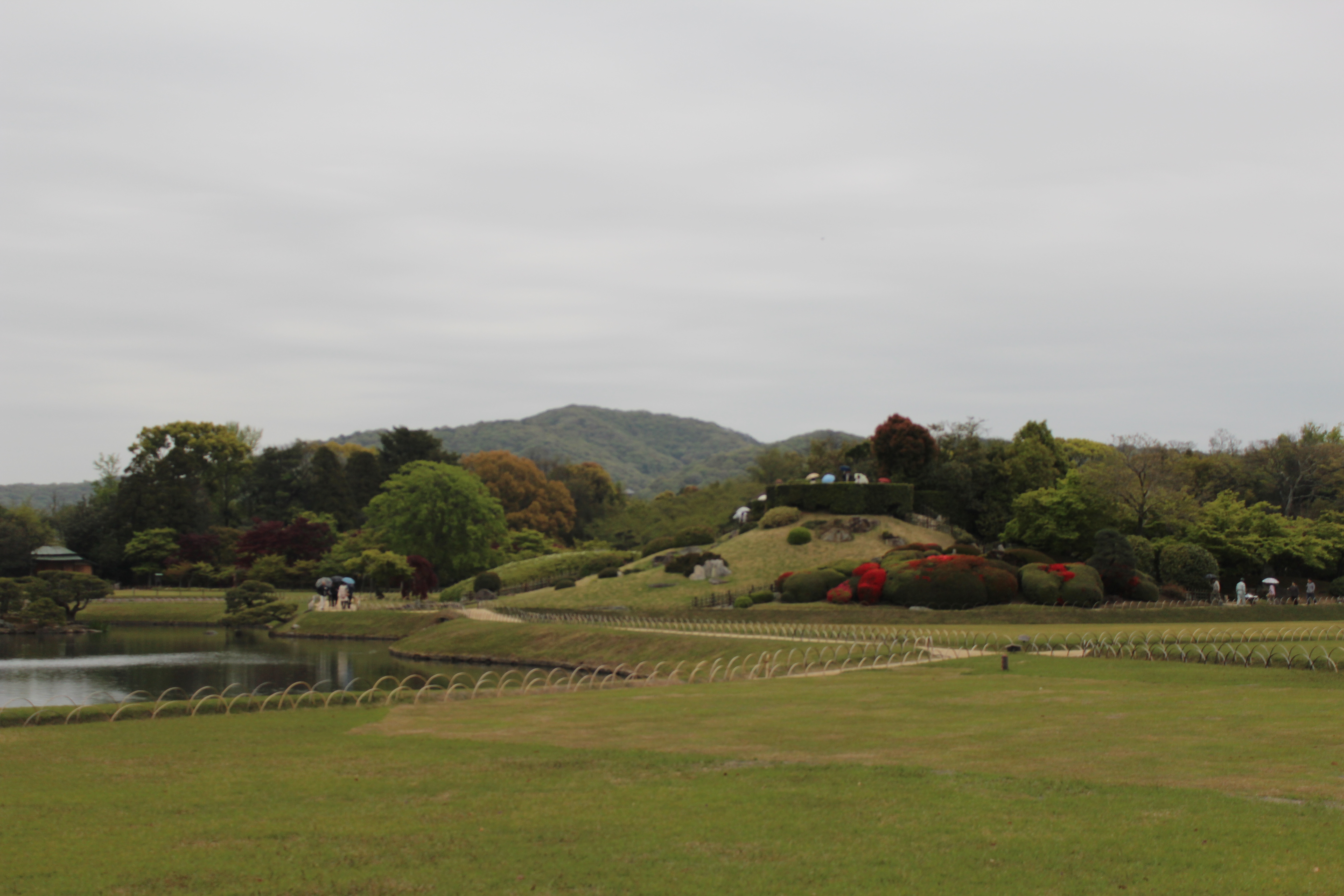 We then walked off to see number two in our great gardens of Japan subquest. Okayama is delightful. It has really funky trams, loads of buses, broad main streets behind which lie lots of atmospheric smaller ones. It feels lively and very cultured. On the way we passed by, and were of course, diverted into  a Saturday flea market in front of a shrine. Lovely pots too big to think about, dubious netsuke, old farm and cooking implements, clothes, books, prints and stall holders rushing to erect gazebos as the rain started. We did however stand on the bridge and watch cormorants in the river before going on into the Koruaken and were well rewarded.