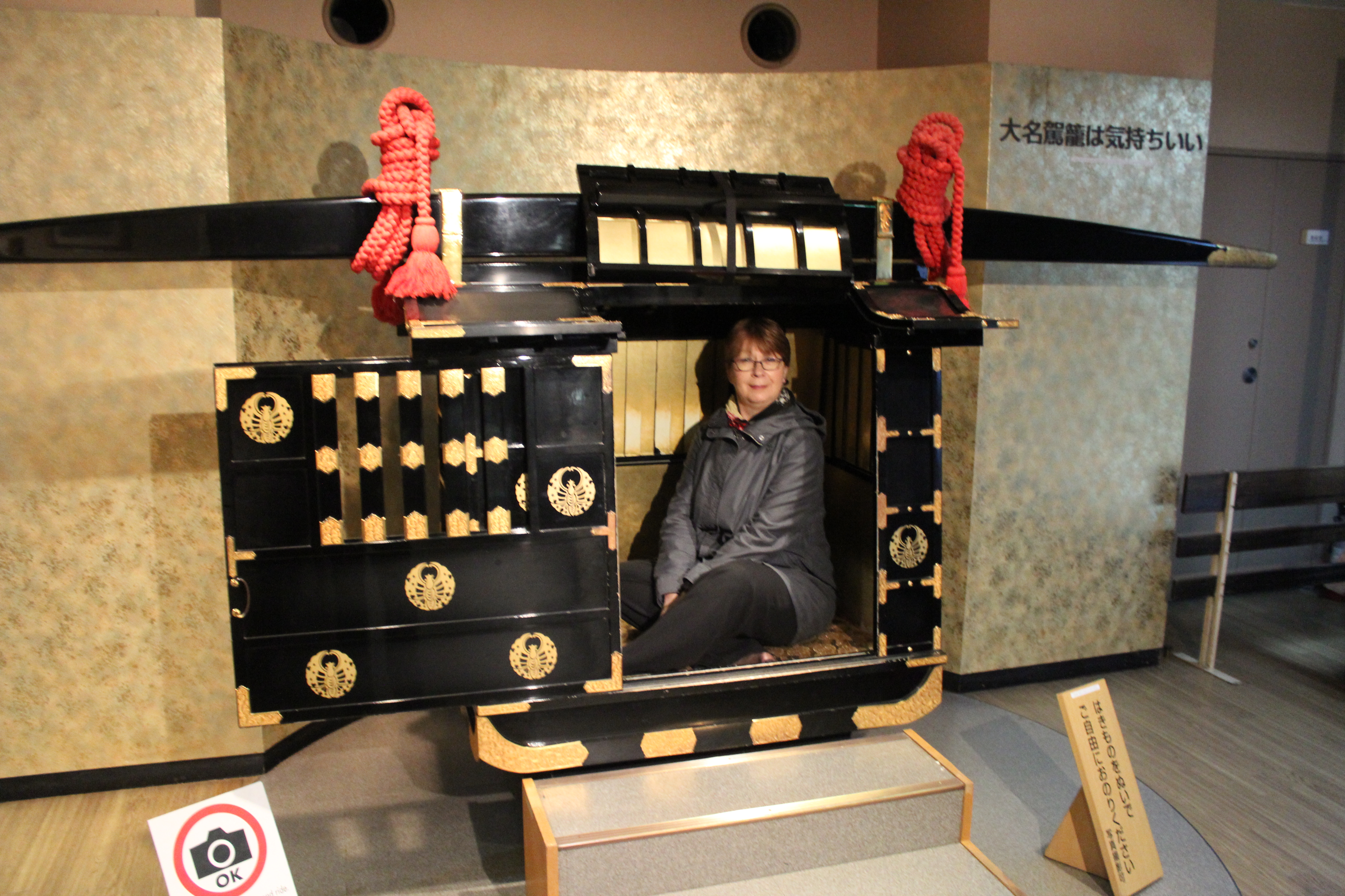 The spaciousness, variety, beauty of the planting and the “borrowed landscape” of a nearby mountain worked superbly. The rain mostly held off too. It’ll also, like Kenrokuen in Kanazawa, have it’s own page when we are back in the UK and can sort the photographs. On then to Okayama Castle which is  impressive and we hoped would have an exhibition of wood block prints, judging from the poster we spied. It did, but only three of them, poorly displayed and part of a bigger exhibit on travel in the Edo period which was interesting but not what we’d hoped for. However the nearly birthday girl did get to be carried in a palanquin!