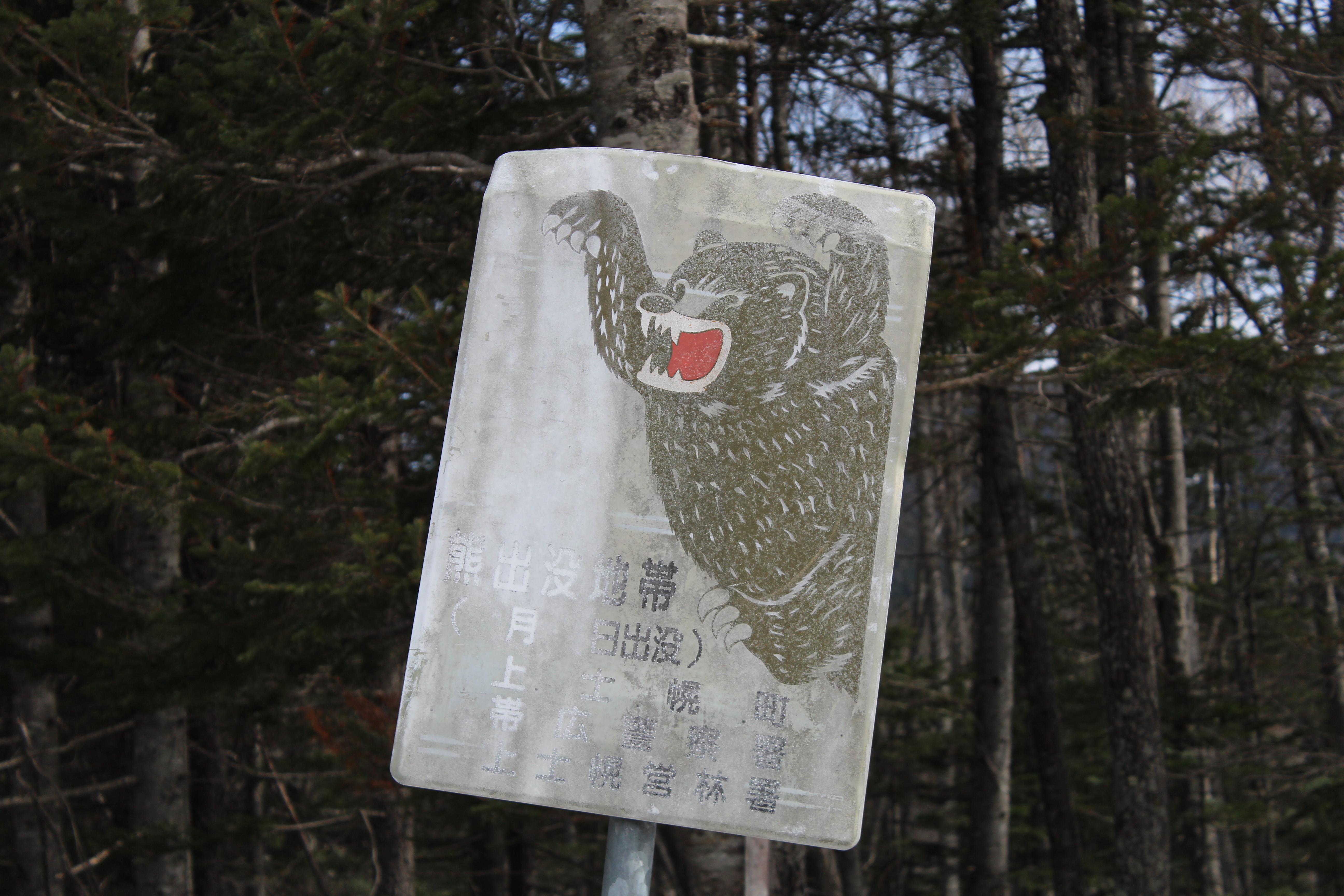 Descending to the high plateau we stopped off at the Higashitaitetsu Nature Centre, a fabulous display of local geological, flora and fauna aspects as well as having an insect collection from around the world. We thought it looked very new and on asking the curator Yasuyuki Oppata how long it had been there, he replied “We opened yesterday.” What a stroke of luck. He was able to tell us what the ubiquitous lime green plants lining the roads were – Fuki-no-tou – which apparently translates as butterbur sprouts. The leaves are boiled and the flowers usually done as tempura. One for the list to try if we see them. While photographing some of them and some lovely wild arums we came across this sign.