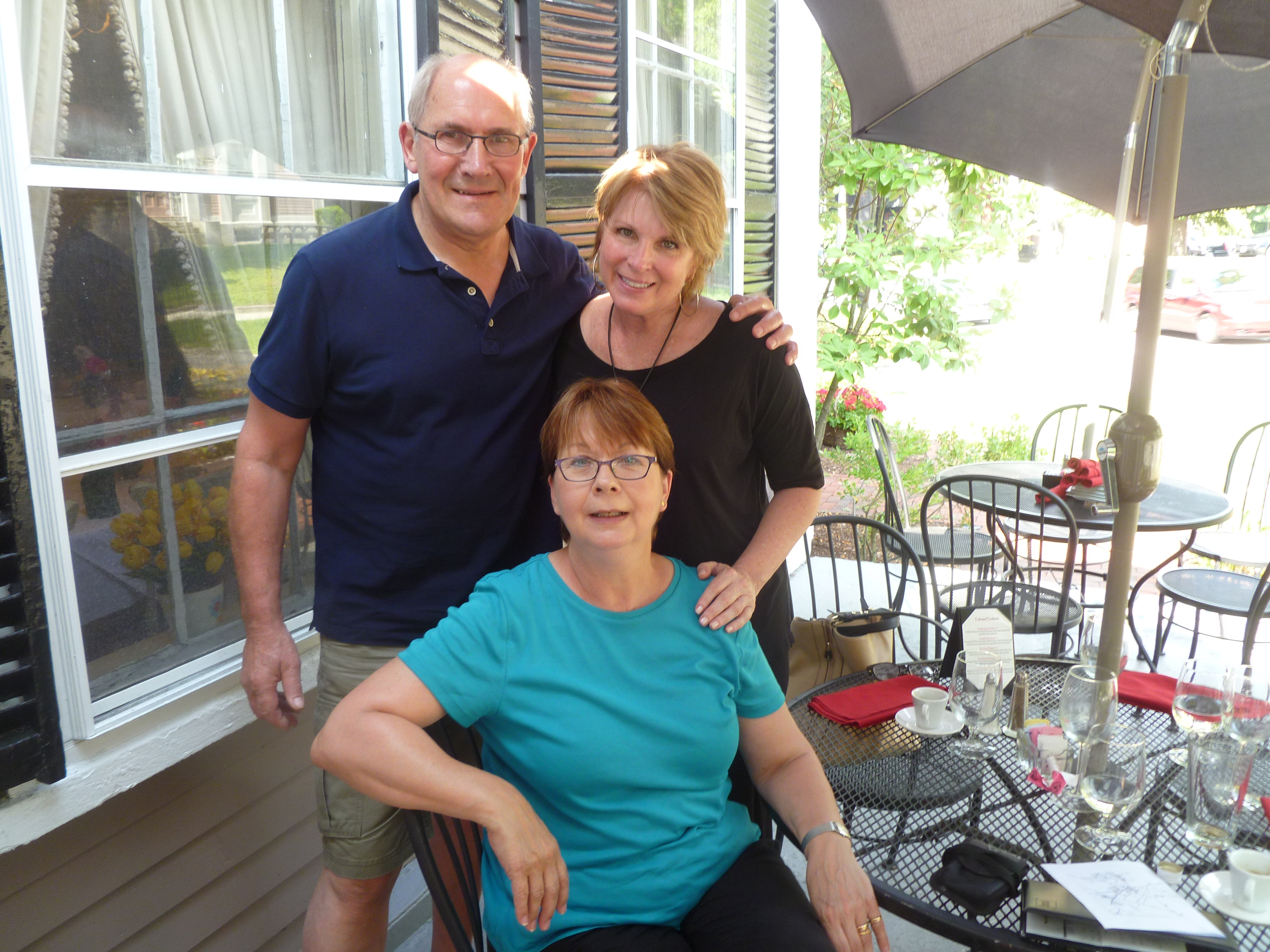 The walk round Walden Pond was excellent and led us to appreciate Thoreau’s concept of sauntering rather than rushing by so as to observe all that is there to see. There’s even, we discovered, a National Sauntering Day on 19 June which we shall be observing in future. The pond is beautiful and there were lots of families enjoying its beaches. We didn’t enter the water but sauntered through the woods chatting about all sorts of issues of mutual interest in a truly delightful morning. Joe and Pat then drove us into Concord where we had arranged to meet Trish Seeney who had been our make-up artist on our first two shoots 20 and 19 years ago.