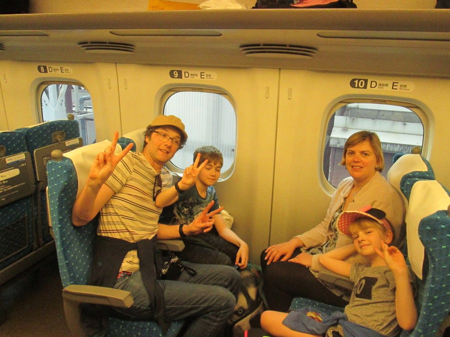 I suppose the number one thing on anybody’s wish list when travelling to Japan is to ride a bullet train. Well Saturday held a day of varied travel for our novices. With lots of luggage and five of us we decided on a taxi from Asakusa to Tokyo Station. Lacy antimacassars and white-gloved drivers are a surprise when you first see them but you realise that cabbies take pride in their work, We didn’t use many but they all wore suits and ties and had enough English to make a joke or respond to ours. Then it was into the station and up to the Shinkansen tracks for a journey to Mishima. The one mistake I’d allowed the ticket office guy to press on me was that our reserved seats were in coach sixteen. How many coaches on a big Shinkansen? You got it. Where does the escalator deliver you on the platform? In the middle. So it was a long trek along the platform and then you have to board very quickly so as to keep to the schedule. I love the way the guard looks along the train, down at the track and mutter phrases to themselves almost like praying for the train’s success. I also like the fact that whenever any official or vendor enters the carriage they bow to it.