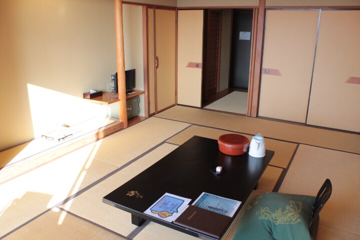 We had to phone our next stop to tell them we were catching the 14:20 bus and a voice confirmed that we would be met at the bus stop. We purchased tickets and boarded the bus for a fantastic voyage. The Izu peninsula is mountainous and we were in the middle and needed to get to the west since the name of our destination was Nishi Izu Koyoi Onsen and I know nishi means west. The first third of the journey was through winding, climbing roads through various spa resorts, golf courses and a Tudor England theme park Niji no Sato (Rainbow Park) which also features a miniature railway modelled on the Romney, Hythe and Dymchurch narrow gauge one in Kent. The bus went in but there were no takers on this occasion. From then on there were trees clinging to sheer mountains, almost as many hairpin bends as Nikko and eventually glimpses of a gorgeous little circular bay. This was indeed the port of Heda our home for the night. I thought all the family would enjoy one night of constant shoes off, shoes on of a traditional Japanese hotel or ryokan so booked this one in hope from the internet. It had pictures of Mount Fuji on its website but then so do most of the hotels in Japan. We were met as promised by a smart lady who took us five minutes to the hotel and treated us to a glass of delicious yuzu juice while checking in took place. We also noted that there was a free whisky offer from 15:00 onwards and a wine dispensing system I’d seen somewhere before. You charge a card and select the amount and type of wine from 10 options until your credit runs out. We were then shown to our adjacent identical rooms. I then caused confusion by asking if there were different rooms for singles and families but it seems they are all 12 mat tatami rooms and futons are laid out for the number of occupants.