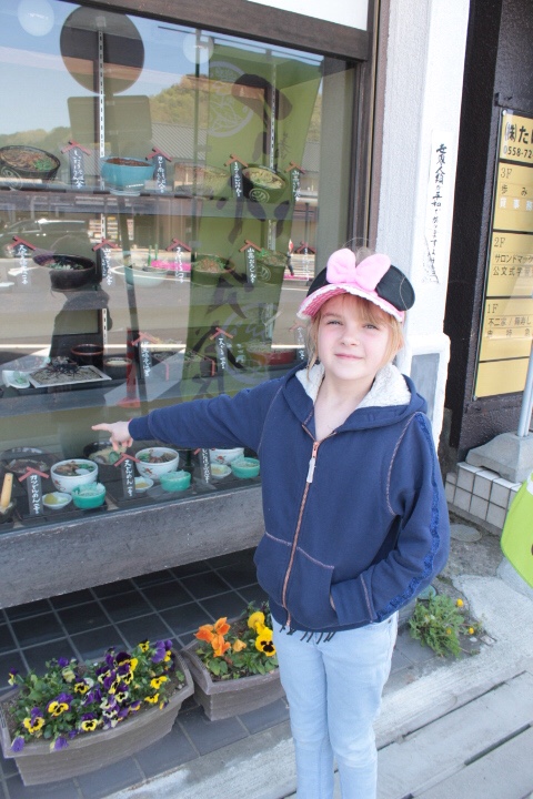 We whizzed off at high speed and through suburbs, tunnels and occasional stretches of countryside and were in Mishima within the hour. It’s over a hundred kilometres and given four station stops speeds must have been up around 180 km/h at times. At Mishima we changed to a local train to Shuzenji which is half way down the Izu peninsula. This was a fun ride with speeds which allowed you to look into peoples’ back gardens, see folk working in the rice fields and admire rural building styles. It also gave me time to contemplate that I had a vivid picture of my phone in the net on the back of the seat in front of me on the Shinkansen – probably in Nagoya by now. I did this five years ago when leaving Tokyo for Hong Kong and somehow it was produced for me to collect in Hong Kong at the airport. At Shuzenji we had to take a bus and sadly because of a change in our departure from Tokyo we had nearly two hours to kill in Shuzenji. Time for lunch. With all our luggage we didn’t want to stray far and despite worries about my granddaughter’s likelihood of finding something she could eat we entered a restaurant with a Japanese only menu, some helpful plastic plates in the window and a proprietress whose English consisted only of numbers, we enjoyed a great traditional Japanese meal.