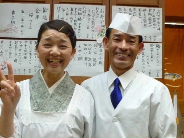 A quick run to Family Mart for a couple of beers – I’m averse to paying minibar prices except in extremis. After the first one slid down one of those moments came over me: “It’s all caught up with me, I really can’t be bothered to go out tonight or even be bothered to eat.” Do you ever get those? I don’t often but … After a severe talking to and a shower I ventured out to sample the delights of downtown Tottori. Just around the corner past the Daimaru department store – no town seems to be without one – I came to an interesting looking bar and ordered a beer an asked for the menu. No food was the reply so I didn’t linger long over my beer, paid and moved on. There was a small covered shopping mall, which also seems obligatory in Japanese towns, which contained a couple of dull looking, nearly empty places. I gave them a miss and was starting to curse my gung-ho alter ego when I hit paydirt. No menu in English, no pictures or plastic samples to point at but some friendly people having a laugh at the bar and a gnarled chef who seemed keen to accommodate me. I couldn’t really tell whether the lady that served me a beer was his wife or daughter but shortly afterwards she placed a fillet of fish in front of me and indicated that it was on the house. A voice piped up in English, “How you find this restaurant?” I replied that I was staying at the New Otani and had come out looking for some food. This prompted gales of laughter from a couple just along from me who confessed they were also staying there and had it recommended. Our concierge recommendations have not been brilliant so I hadn’t even bothered. With the help of the first voice who was an art dealer from Galerie Nichida in Nagoya and had studied in America, the couple said they had spent their honeymoon in London four years ago – second time around for both and now on a trip to celebrate their retirement. The conversation moved onto age, oh and by this time I had a plate of fabulous sashimi fresh from the sea today and some local, very good sake, and I arm wrestled the chef metaphorically, asking why he hadn’t retired if he was so old. He enjoyed the business, closed for three hours a day to go fishing, lived upstairs and what else would he do? Sign language, help from the gallerist and recourse to my phrase book made for quite a coherent chat. I won the age contest as he was only 68 although looked older than me. They were all suitably impressed at my venturing out alone in provincial Japan at such a great age. Some tempura including ginger root, asparagus and forest vegetables according to the book followed and then chef gave me a bowl of miso soup with some crabs legs – a speciality of the area. The evening ended with more local sake and an impromptu Beatles medley – chef is a huge fan – wife or daughter presented an extremely modest bill and I left thinking about what fun I’d have missed if I’d just flopped in the hotel. It reminded me of the night before Dee’s birthday five years ago in Okayama when we became firm friends with the couple who ran the bar.