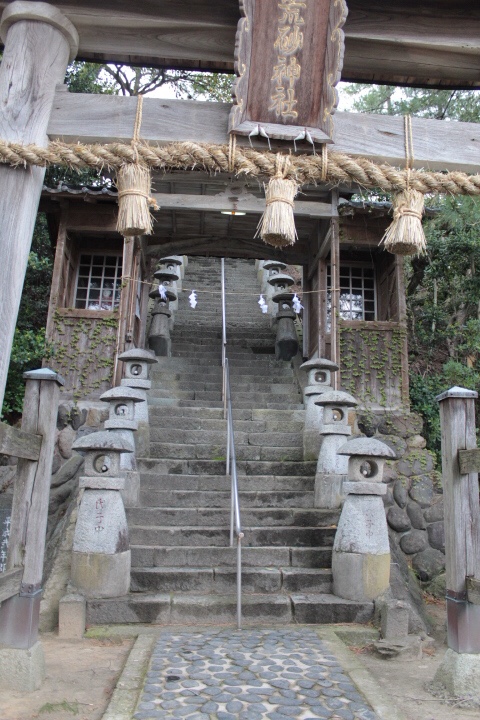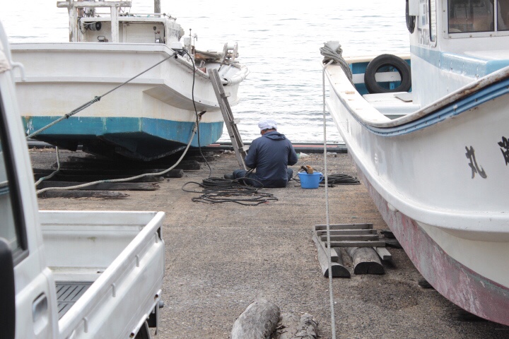 The whole coast along this stretch has been designated the San-in National Park and was awarded UNESCO Geopark status in 2010. I explored an immediate stretch of, frankly not that impressive dunes when you’ve seen Braughton Burrows and the Coto Donana. However I spied a village and set off to explore. It was Iwami and behind a fisherman mending his boat was a shrine – no chance of getting a stamp here but the steps beckoned up towards the unpretentious Ajiro shrine.
