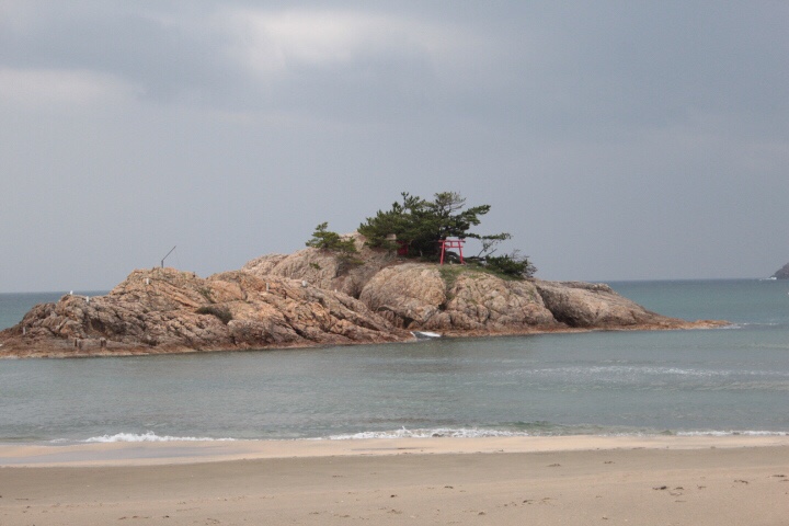 On the short stretch I was able to admire stacks and archways, not quite as dramatic as Galicia’s Cathedral Beach, but most enjoyable. There are also caves and interesting geological features warranting the UNESCO designation. The the road dropped down into Higashihama with its wide sandy beach and an island shrine you have to swim to or perhaps take a boat. However there was another shrine on the beach and I declined its invitation to climb these steps.