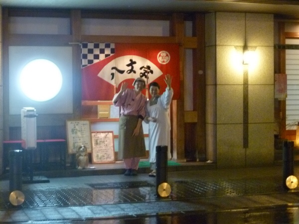 A quick run to Family Mart for a couple of beers – I’m averse to paying minibar prices except in extremis. After the first one slid down one of those moments came over me: “It’s all caught up with me, I really can’t be bothered to go out tonight or even be bothered to eat.” Do you ever get those? I don’t often but … After a severe talking to and a shower I ventured out to sample the delights of downtown Tottori. Just around the corner past the Daimaru department store – no town seems to be without one – I came to an interesting looking bar and ordered a beer an asked for the menu. No food was the reply so I didn’t linger long over my beer, paid and moved on. There was a small covered shopping mall, which also seems obligatory in Japanese towns, which contained a couple of dull looking, nearly empty places. I gave them a miss and was starting to curse my gung-ho alter ego when I hit paydirt. No menu in English, no pictures or plastic samples to point at but some friendly people having a laugh at the bar and a gnarled chef who seemed keen to accommodate me. I couldn’t really tell whether the lady that served me a beer was his wife or daughter but shortly afterwards she placed a fillet of fish in front of me and indicated that it was on the house. A voice piped up in English, “How you find this restaurant?” I replied that I was staying at the New Otani and had come out looking for some food. This prompted gales of laughter from a couple just along from me who confessed they were also staying there and had it recommended. Our concierge recommendations have not been brilliant so I hadn’t even bothered. With the help of the first voice who was an art dealer from Galerie Nichida in Nagoya and had studied in America, the couple said they had spent their honeymoon in London four years ago – second time around for both and now on a trip to celebrate their retirement. The conversation moved onto age, oh and by this time I had a plate of fabulous sashimi fresh from the sea today and some local, very good sake, and I arm wrestled the chef metaphorically, asking why he hadn’t retired if he was so old. He enjoyed the business, closed for three hours a day to go fishing, lived upstairs and what else would he do? Sign language, help from the gallerist and recourse to my phrase book made for quite a coherent chat. I won the age contest as he was only 68 although looked older than me. They were all suitably impressed at my venturing out alone in provincial Japan at such a great age. Some tempura including ginger root, asparagus and forest vegetables according to the book followed and then chef gave me a bowl of miso soup with some crabs legs – a speciality of the area. The evening ended with more local sake and an impromptu Beatles medley – chef is a huge fan – wife or daughter presented an extremely modest bill and I left thinking about what fun I’d have missed if I’d just flopped in the hotel. It reminded me of the night before Dee’s birthday five years ago in Okayama when we became firm friends with the couple who ran the bar.