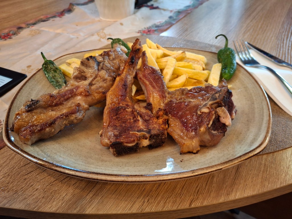 I’m not fan of photographing meals but my lamb cutlets for my last lunch were worthy and very tasty as well – but no hot padron peppers! Then back to the hotel to collect cases and the C6 bus to the airport. It’s every 15 minutes and whisks us via the train station and then through the newish suburbs, past a huge desalination plant and along the beach at Playa de Agua Amarga before turning west to the airport.