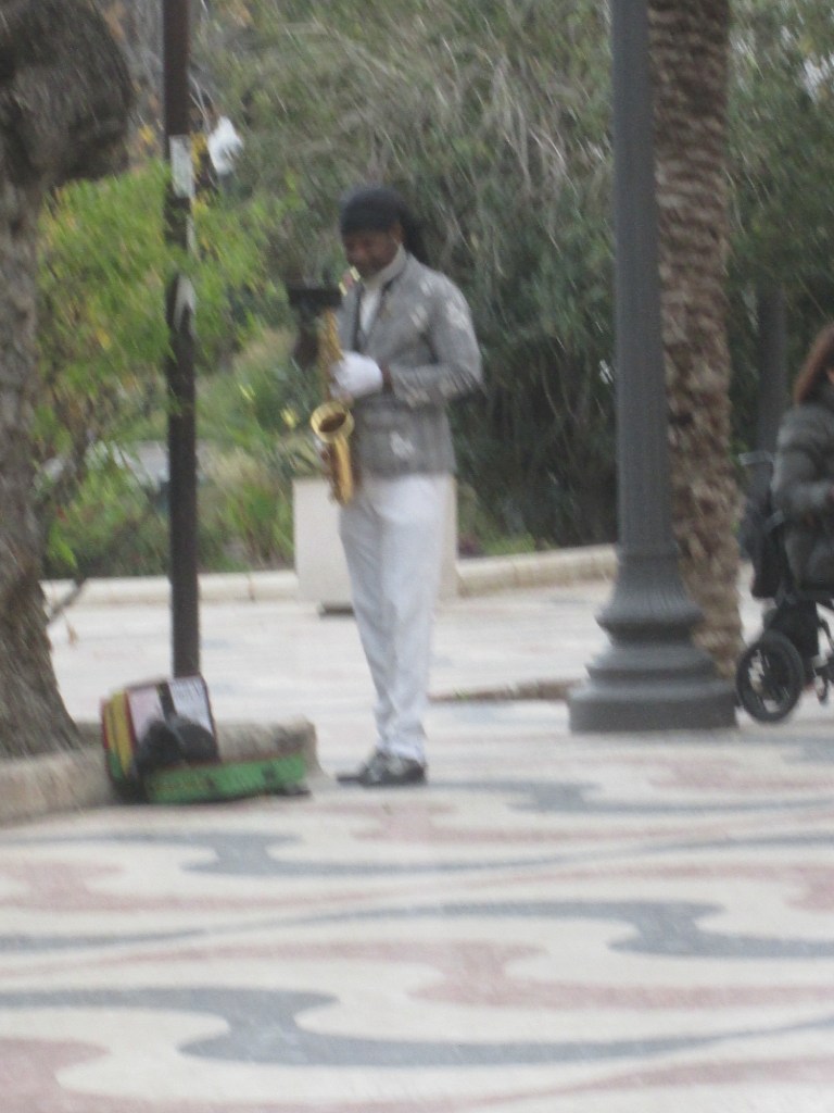 Down by the marina a lone saxophonist busker was trying hard but basically was practising his scales in public with scores on a phone attached to his alto.