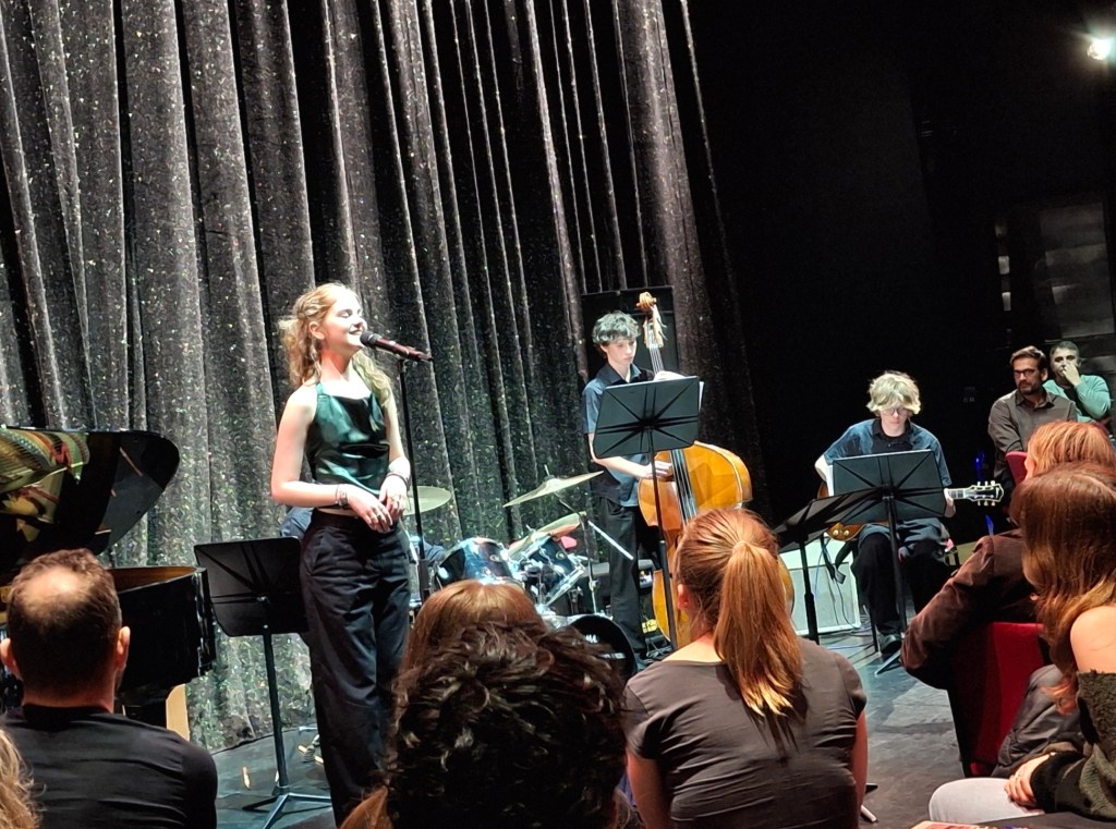 After that it was a visit to Langley Park Boys School for an ‘Evening of Jazz’ in which my granddaughter was playing flute in the big band numbers. The evening opened with a quintet featuring Sam on tenor sax who had guested with Soulstice last week at Off the Cuff. They were very good as were the big band that played a few standards. Then to my surprise after Soulstice lead singer Bea had sung Round Midnight, Trixi (Daisy) stepped up to the mic to sing Dream a Little Dream for Me. Her parents had failed to inform proud grandad that she was a featured soloist as well and she gave an emotional rendition of a fine thirties song imbuing Gus Kahn’s lyric with a real sense of longing. The whole evening was a further confirmation of the immense depth of talent that is produced when the arts in schools are properly respected and resourced. Soap box suspended for now!