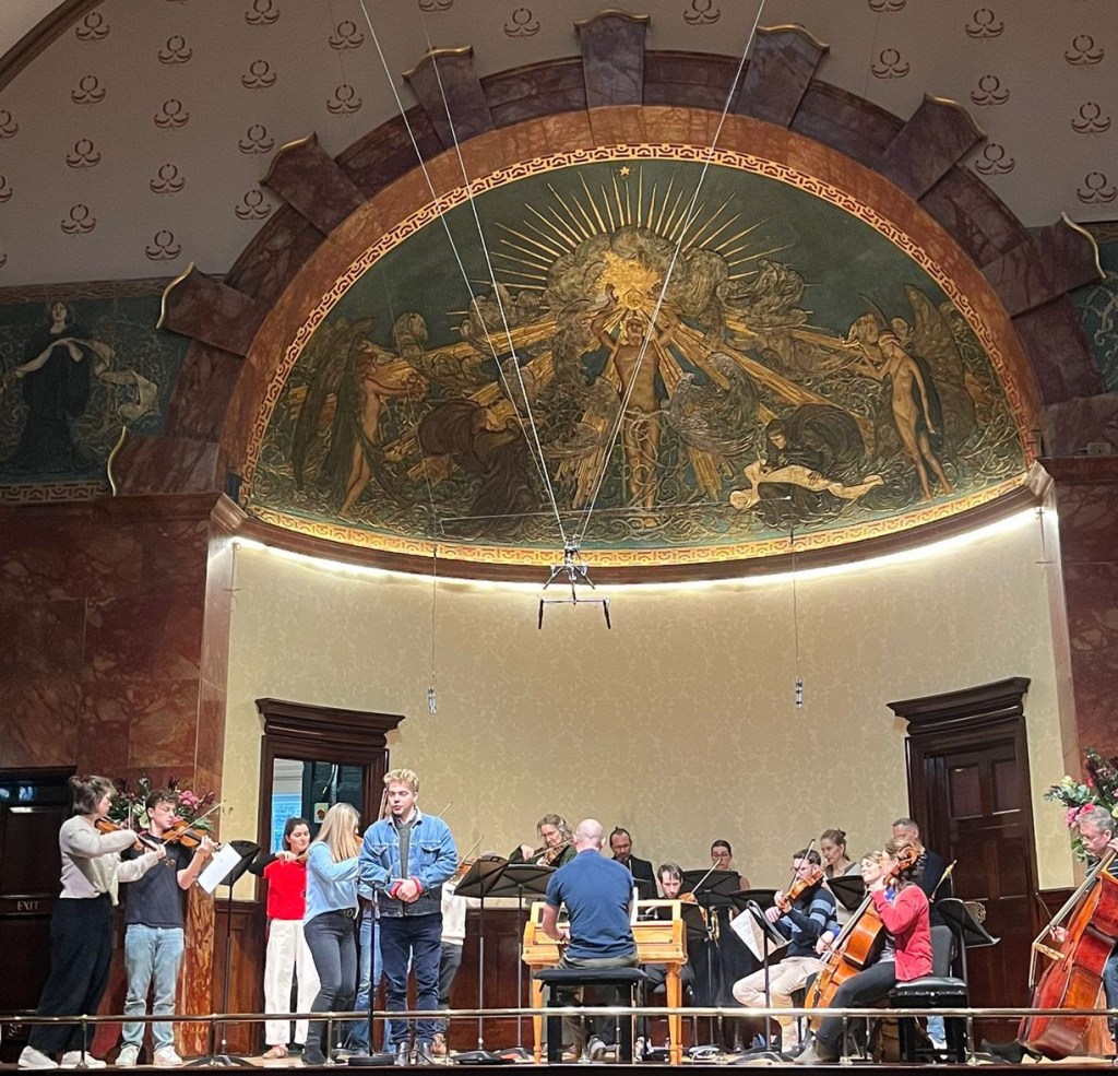 Having heard last week Mozart’s last three symphonies, each half of the evening began with two of his earliest ones, numbers 1 and 4. Short, sharp and lively, they set the sense of fun for the evening which involved works which Tenducci had sung or were by his friends and contemporaries. Tenducci’s role was taken by the excellent countertenor Hugh Cutting who expressed his delight that high range male soprano voices were no longer the result of mutilation. He sang arias by Gluck, Thomas Arne, J C Bach and Mozart and as an opera singer he filled them with expressiveness and drama. The orchestral playing in an oboe concerto by Johann Christian Fischer and the symphonies and a rollicking version of Tommaso Giordani’s Overture and Irish Medley which contained well-known Irish folk tunes was brilliant with a small orchestra filling the hall with an eclectic and delightful programme. And afterwards I was able to catch up with violinist Jenna Raggett as she and fellow violin players were taking a selfie. And the IBO conveniently posted photos of the rehearsal and the final bow.