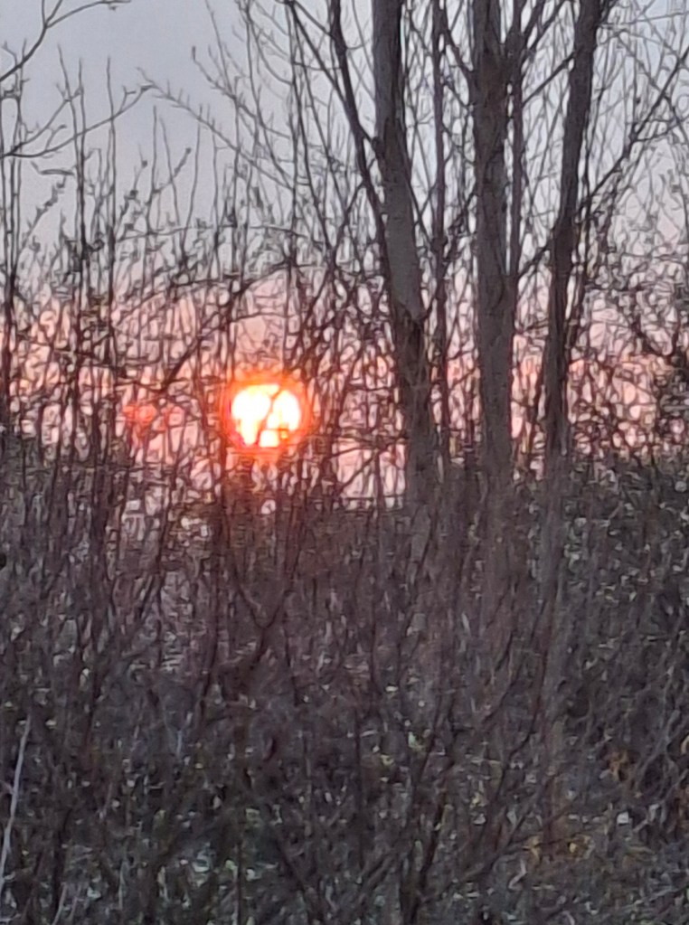Finally after all the gloom of the year to date we had a few days of sun and I was able to plant some vegetables – broad beans and parsnips so far – check on the onions and garlic planted last autumn and do the annual hack and slash of all the dead brush from last year’s flowers. Then as I turned to go indoors the sunset showed me my next big task. The tree in the left foreground is my quince which has given us so much membrillo and jelly over the years but has lots of overlapping branches and needs a really good prune. A start has been made.