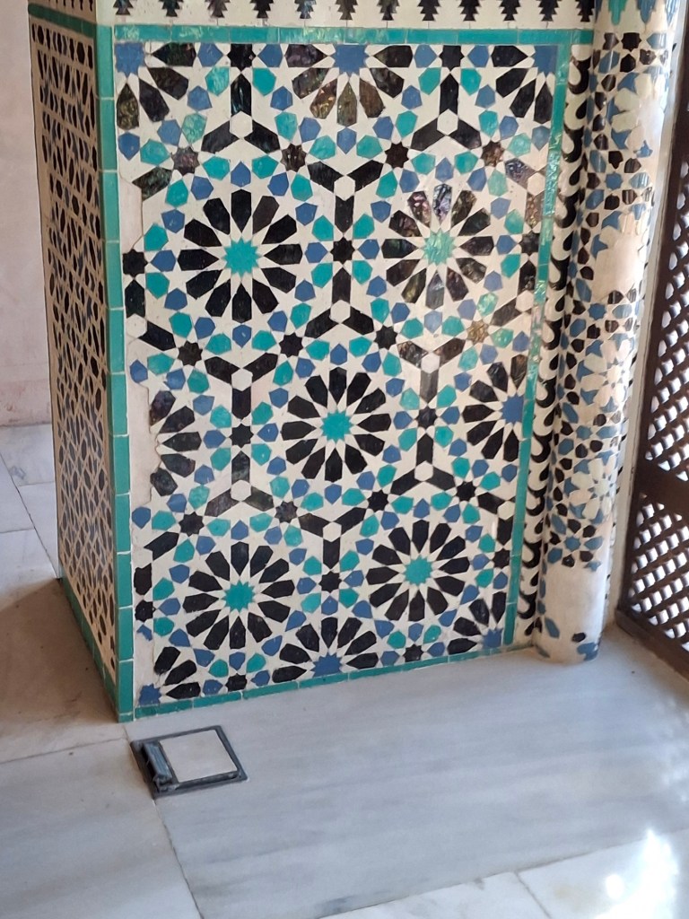 Not far from here was something that had escaped my plans for visits – the Cuarto Real de San Domingo. It’s free on Sundays so why not? A pleasant enough garden leads to a modern construction covering the remains of an Arab palace built before the Alhambra in the 13th century. Excavated floor layouts can be seen through a glass platform (slightly unnerving), with tiles, mosaics and walls indicating the palace arrangements. When the Dominicans took it over they demolished most of it but kept the qubba which has the fabulous decoration styles that were later repeated in its more famous companion up the hill. The space also has occasional exhibitions although not today. I’m glad I found it at the next-to-last minute.