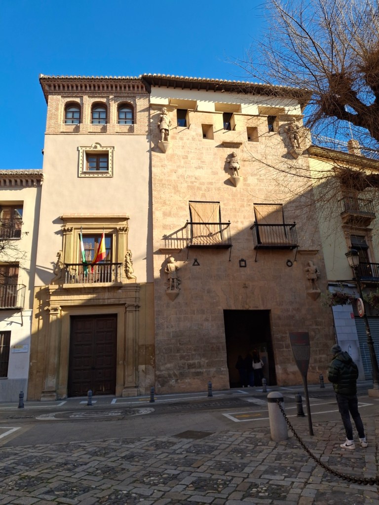 The upper floors were devoted to material about the city – important figures – Ganivet was there of course, room layouts from various periods when the building was the arts hub of Granada, posters from events, newspaper cuttings, photographs, including de Falla and Lorca. There was a wonderfully ornate set of toasting forks and a great quilt. It was well worth the wait.